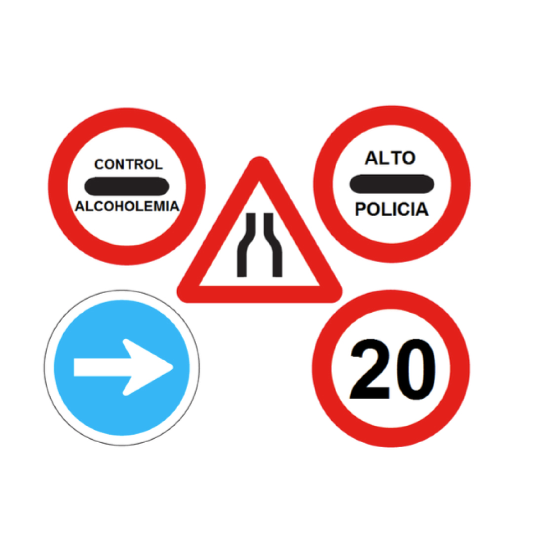 Composición de Señales: Incluye 5 señales plegables (4 circulares de Ø50cm y 1 triangular de L70cm). Todas ellas están fabricadas con material Reflex N1 para la máxima visibilidad.